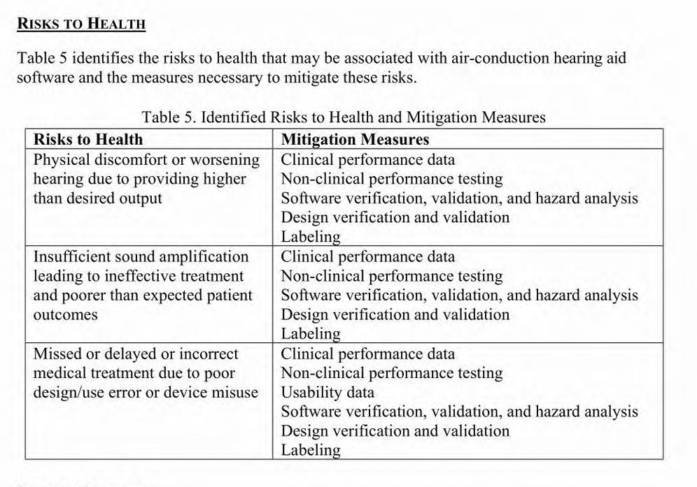 I reviewed the De Novo Classification request for the “Hearing Aid Feature” (HAF) which refers to the software within the AirPods Pro 2 (hardware) to allow them to function as OTC hearing aids. It is described as “a software-only mobile medical application that is intended to be used with compatible wearable electronic products”. The indications for use follow the FDA criteria for OTC hearing aids to specify use for people 18 years and older with perceived mild to moderate hearing impairment.