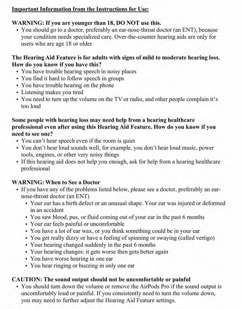 Below is a screenshot of the Instructions for use. I am pleasantly surprised to see language directing the end user to seek additional help from a hearing healthcare professional if they have continuing hearing concerns or limitations to the Hearing Aid Feature functionality.